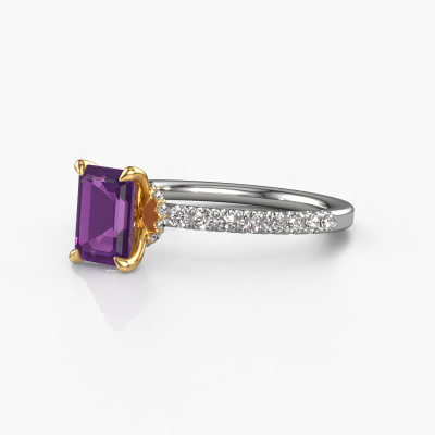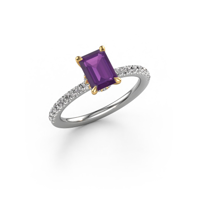 The ring shown above is called the Crystal EME 4. We call this type of ring a pavé solitaire ring because it has one centre gemstone and a band that is also pave set with gemstones. The 14 Carat white gold engagement ring is set with a emerald cut 7x5 mm amethyst centre stone and the band is pave set with lab grown diamond gemstones. Each jewel is created to add sparkle to your finger, each jewel is lovingly made by hand by our goldsmiths.This fashionable white gold pavé solitaire engagement ring has an exquisite emerald cut amethyst centre stone. To further accentuate the centre stone, the band is fully set with more lab-grown diamonds. Its open prong setting allows light to strike the amethyst from various angles and this adds sparkle to your amethyst ring. The photo shown above depicts the goldsmith's carefully handcrafted details of the ring. The high positioning of the centre stone is truly eye-catching. The perfect engagement ring for the crown jewel of your life! After receiving your order, our goldsmiths will passionately start the creative process of making your engagement ring in our own studio. Because we don't have a big stockpile, these costs will not be passed on to you. Our pricing is proof of that! We offer top quality jewels at lowest price, guaranteed.Our team adds new designs to our online collection daily. Our designers and goldsmiths work together in creating the best design. We strive to offer a diverse collection of jewels. Perhaps you have a specific jewel design in mind. One you came across somewhere. Please contact us for a free consultation. We will make you an offer, based on a fair price/ quality ratio, that will baffle you.To make it easier for you, we offer a 30 day return policy. Check our terms and conditions.