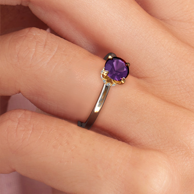 The ring shown above is called the Crystal RND 3, we call this a solitaire ring because it contains a single gemstone. The engagement ring is made in 14 Carat white gold and has a round amethyst of 5.5 mm. The cool thing about our configurator is that you can compile your own piece of jewellery, into a completely personalized one. This solitaire ring is crafted in the precious metals white gold with gold, but of course you are free to pick your own colours. Each piece of jewellery is made with passion and love by one of our master goldsmiths.The solitaire ring is a special type of engagement ring. Its open prong setting allows light to strike the gemstone from various angles. This classic engagement ring is a stunning eye-catcher because of the high positioning of the gemstone. In order for you to commemorate your proposal with a unique ring, we carefully adorn this solitaire ring by hand. The love of your life deserves nothing but the best. By using a combination of the latest modern techniques, combined with ancient crafting, we can make all our engagement rings in our own studio. Each jewel is made to order. This is advantageous because we can offer you a price you won't find anywhere else.Different styles of new rings are made daily by our team. Perhaps you have found a solitaire engagement ring somewhere. One you would like to give to your loved one. Please feel free to share your thoughts and design with our jewel designers. We would love to turn your design into a classic engagement ring. You can follow the development of your ring design because we use very detailed 3D drawings. On top of that, you can order a dummy of the design. A dummy is a plastic ring, which can be shaped according your ring design. You can try it on and check if the engagement ring is up to standard. We will gladly send you a non-binding offer, based on a fair price/ quality ratio. The offer will baffle you, considering the quality of the ring and gemstones.To make it easier for you, we offer a 30 day return policy. Check our terms and conditions.