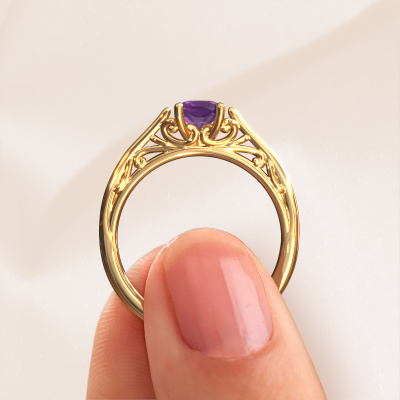 This 14 Carat gold ring is called Shannon cus and is set with 5 mm amethyst. What is it that makes your relationship unique? What is it about her that makes you want to bend down on one knee? The unique bond between the two of you is emphasized by an equally unique ring. A one of a kind ajour solitaire engagement ring made especially for her. That is why this Celtic ring fits her like a glove. Each specific detail of this ajour gold amethyst set engagement ring is hand-picked, crafted and polished by our expert goldsmith. The result is an exquisite ring, unique and perfectly crafted to perfection. That is what our expert Goldsmiths strive for. This jewel is made just for you, with attention to detail and design.By using our modern techniques, we can design and customize the finest quality jewels with the utmost care for you. Our engagement rings are always priced 30 percent lower than other jewellers. We make engagement rings to order so we don't have to maintain a large stock. If you have a certain budget, we are more than happy to advice you accordingly.Our team adds new designs to our online collection daily. Our designers and goldsmiths work together in creating the best design. We strive to offer a diverse collection of jewels. Perhaps you have a specific jewel design in mind. One you came across somewhere. Please contact us for a free consultation. We will make you an offer, based on a fair price/ quality ratio, that will baffle you.To make it easier for you, we offer a 30 day return policy. Check our terms and conditions.