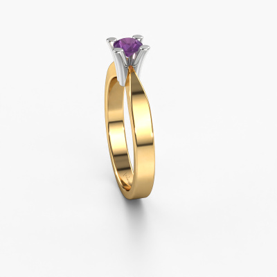 In your eyes, no one else compares to her. She is one in a million, unlike anyone else and pure? These qualities are emphasized perfectly by our traditional gold solitaire amethyst ring. This amethyst is carefully selected by our keen artisan goldsmiths. It equals the unique qualities of the love of your life. There is no better way to memorialize your proposal than this symbol of true love. The ring shown above is called the Ichelle 1, we call this a solitaire ring because it contains a single gemstone. The engagement ring is made in 14 Carat gold and has a round amethyst of 4.2 mm. Each piece of jewellery is made with passion and love by one of our master goldsmiths.After receiving your order, our goldsmiths will start the creative process of making your Ichelle 1 engagement ring. We don't keep stock. This is advantageous because these costs will not be passed on to you. Therefore, we can offer jewellery at exceptionally low prices.Have you found a specific engagement ring somewhere which you would like to give to your loved one? Please feel free to express your wishes to our jewel designers because we would be honoured to turn your design into a traditional engagement ring. You can follow the development of your ring design because we use 3D drawings. This gives you a realistic preview of how your design will look. You can also preorder a dummy. A dummy is a plastic ring, which can be shaped according your ring design. You can try it on and check if its width and size are suitable for you. We will gladly send you a non-binding offer, based on a fair price/ quality ratio. It will amaze you, considering the quality of the ring and gemstones.To make it easier for you, we offer a 30 day return policy. Check our terms and conditions.