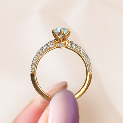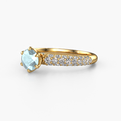 The ring shown above is called the Meryl. We call this type of ring a pavé solitaire ring because it has one centre gemstone and a band that is also pave set with gemstones. This engagement ring is made in 14 Carat gold set with a 5.7 mm round aquamarine, and pave set diamonds at the sides. Each piece of jewellery is made just for you, with attention to detail and design.This exclusive gold pavé solitaire engagement ring has an exquisite round aquamarine centre stone. To further accentuate the centre stone, the band is set full with more diamonds. Its open prong setting allows light to strike the aquamarine from various angles and this adds sparkle to your aquamarine ring. The photo shown above depicts the goldsmith's carefully handcrafted details of the ring. The high positioning of the centre stone is truly eye-catching. The perfect engagement ring for the crown jewel of your life!After receiving your order, our goldsmiths will passionately start the creative process of making your engagement ring in our own studio. Because we don't have a big stockpile, these costs will not be passed on to you. Our pricing is proof of that! We offer top quality jewels at lowest price, guaranteed.Have you found a specific engagement ring somewhere which you would like to give to your loved one? Please feel free to express your wishes to our jewel designers because we would be honoured to turn your design into a exclusive engagement ring. You can follow the development of your ring design because we use 3D drawings. This gives you a realistic preview of how your design will look. You can also preorder a dummy. A dummy is a plastic ring, which can be shaped according your ring design. You can try it on and check if its width and size are suitable for you. We will gladly send you a non-binding offer, based on a fair price/ quality ratio. It will amaze you, considering the quality of the ring and gemstones.To make it easier for you, we offer a 30 day return policy. Check our terms and conditions.