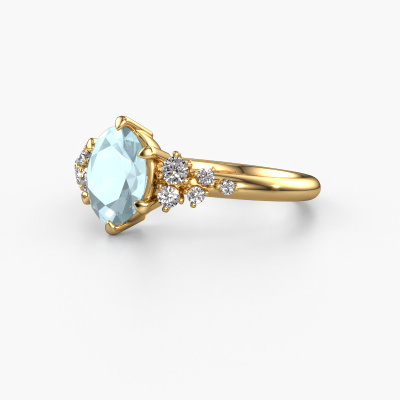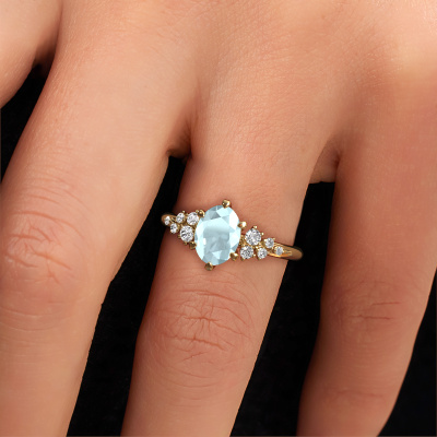 The ring shown above is called the Royce OVL. We call this type of ring a pavé solitaire ring because it has one centre gemstone and a band that is also pave set with gemstones. This engagement ring is made in 14 Carat gold set with a 8x6 mm oval aquamarine, and pave set lab-grown diamonds at the sides. Each piece of jewellery is made with passion and love by one of our master goldsmiths.This fantasy gold pavé solitaire engagement ring has an exquisite oval aquamarine centre stone. To further accentuate the centre stone, the band is set full with more lab-grown diamonds. Its open prong setting allows light to strike the aquamarine from various angles and this adds sparkle to your aquamarine ring. The photo shown above depicts the goldsmith's carefully handcrafted details of the ring. The high positioning of the centre stone is truly eye-catching. The perfect engagement ring for the crown jewel of your life!After receiving your order, our goldsmiths will passionately start the creative process of making your engagement ring in our own studio. Because we don't have a big stockpile, these costs will not be passed on to you. Our pricing is proof of that! We offer top quality jewels at lowest price, guaranteed.Have you found a specific engagement ring somewhere which you would like to give to your loved one? Please feel free to express your wishes to our jewel designers because we would be honoured to turn your design into a fantasy engagement ring. You can follow the development of your ring design because we use 3D drawings. This gives you a realistic preview of how your design will look. You can also preorder a dummy. A dummy is a plastic ring, which can be shaped according your ring design. You can try it on and check if its width and size are suitable for you. We will gladly send you a non-binding offer, based on a fair price/ quality ratio. It will amaze you, considering the quality of the ring and gemstones.To make it easier for you, we offer a 30 day return policy. Check our terms and conditions.