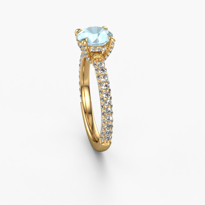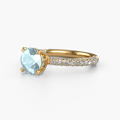The ring shown above is called the Saskia rnd 2. We call this type of ring a pavé solitaire ring because it has one centre gemstone and a band that is also pave set with gemstones. The 14 Carat gold engagement ring is set with a round 7 mm aquamarine centre stone and the band is pave set with lab grown diamond gemstones. Each jewel is made by a team of passionate goldsmiths and jewel designers. This will make your crown jewel truly eye-catching.This exclusive gold pavé solitaire engagement ring has an exquisite round aquamarine centre stone. To further accentuate the centre stone, the band is fully set with more lab-grown diamonds. Its open prong setting allows light to strike the aquamarine from various angles and this adds sparkle to your aquamarine ring. The photo shown above depicts the goldsmith's carefully handcrafted details of the ring. The high positioning of the centre stone is truly eye-catching. The perfect engagement ring for the crown jewel of your life! After receiving your order, our goldsmiths will passionately start the creative process of making your engagement ring in our own studio. Because we don't have a big stockpile, these costs will not be passed on to you. Our pricing is proof of that! We offer top quality jewels at lowest price, guaranteed.Our team adds new designs to our online collection daily. Our designers and goldsmiths work together in creating the best design. We strive to offer a diverse collection of jewels. Perhaps you have a specific jewel design in mind. One you came across somewhere. Please contact us for a free consultation. We will make you an offer, based on a fair price/ quality ratio, that will baffle you.To make it easier for you, we offer a 30 day return policy. Check our terms and conditions.