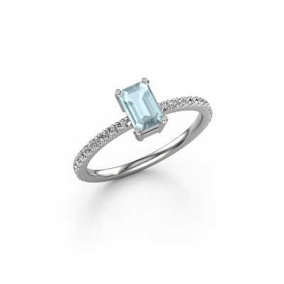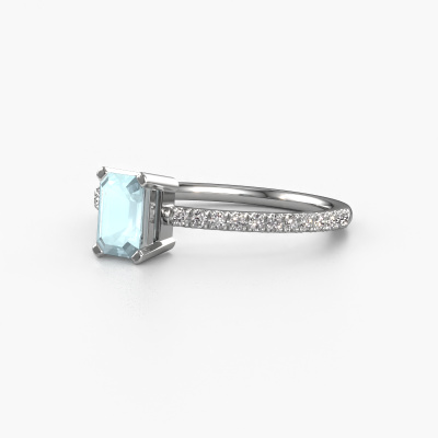 The ring shown above is called the Denita 2 EME. We call this type of ring a pavé solitaire ring because it has one centre gemstone and a band that is also pave set with gemstones. This engagement ring is made in platinum set with a 6x4 mm emerald cut aquamarine, and pave set diamonds at the sides. Each piece of jewellery is made just for you by our master goldsmiths in our own studio.This traditional platinum pavé solitaire engagement ring has an exquisite emerald cut aquamarine centre stone. To further accentuate the centre stone, the band is set full with more diamonds. Its open prong setting allows light to strike the aquamarine from various angles and this adds sparkle to your aquamarine ring. The photo shown above depicts the goldsmith's carefully handcrafted details of the ring. The high positioning of the centre stone is truly eye-catching. The perfect engagement ring for the crown jewel of your life!Are you on a budget? Please feel free to contact us, so we can go discuss your options. We offer our engagement rings at guaranteed best price, because we make them to order. You won't find such a price anywhere else!Our team adds new designs to our online collection daily. Our designers and goldsmiths work together in creating the best design. We strive to offer a diverse collection of jewels. Perhaps you have a specific jewel design in mind. One you came across somewhere. Please contact us for a free consultation. We will make you an offer, based on a fair price/ quality ratio, that will baffle you.To make it easier for you, we offer a 30 day return policy. Check our terms and conditions.