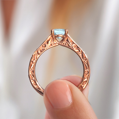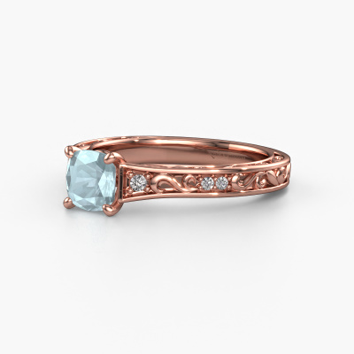 The ring shown above is called the Mallory cus. We call this type of ring a pavé solitaire ring because it has one centre gemstone and a band that is also pave set with gemstones. This engagement ring is made in 14 Carat rose gold set with a 5.5 mm cushion aquamarine, and pave set diamonds at the sides. Each piece of jewellery is made just for you by our master goldsmiths in our own studio.This Celtic rose gold pavé solitaire engagement ring has an exquisite cushion aquamarine centre stone. To further accentuate the centre stone, the band is set full with more diamonds. Its open prong setting allows light to strike the aquamarine from various angles and this adds sparkle to your aquamarine ring. The photo shown above depicts the goldsmith's carefully handcrafted details of the ring. The high positioning of the centre stone is truly eye-catching. The perfect engagement ring for the crown jewel of your life!By using our modern techniques, we can design and customize the finest quality jewels with the utmost care for you. Our engagement rings are always priced 30 percent lower than other jewellers. We make engagement rings to order so we don't have to maintain a large stock. If you have a certain budget, we are more than happy to advice you accordingly.Different styles of new rings are made daily by our team. Perhaps you have found a pavé solitaire engagement ring somewhere. One you would like to give to your loved one. Please feel free to share your thoughts and design with our jewel designers. We would love to turn your design into a Celtic engagement ring. You can follow the development of your ring design because we use very detailed 3D drawings. On top of that, you can order a dummy of the design. A dummy is a plastic ring, which can be shaped according your ring design. You can try it on and check if the engagement ring is up to standard. We will gladly send you a non-binding offer, based on a fair price/ quality ratio. The offer will baffle you, considering the quality of the ring and gemstones.To make it easier for you, we offer a 30 day return policy. Check our terms and conditions.