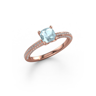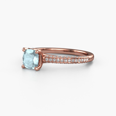 The ring shown above is called the Elenore cus. We call this type of ring a pavé solitaire ring because it has one centre gemstone and a band that is also pave set with gemstones. This engagement ring is made in 14 Carat rose gold set with a 5.5 mm cushion aquamarine, and pave set lab-grown diamonds at the sides. Each piece of jewellery is made by a team of passionate goldsmiths and jewel designers. This will make your crown jewel truly eye-catching.This contemporary rose gold pavé solitaire engagement ring has an exquisite cushion aquamarine centre stone. To further accentuate the centre stone, the band is set full with more lab-grown diamonds. Its open prong setting allows light to strike the aquamarine from various angles and this adds sparkle to your aquamarine ring. The photo shown above depicts the goldsmith's carefully handcrafted details of the ring. The high positioning of the centre stone is truly eye-catching. The perfect engagement ring for the crown jewel of your life!After receiving your order, our goldsmiths will start the creative process of making your Elenore cus engagement ring. We don't keep stock. This is advantageous because these costs will not be passed on to you. Therefore, we can offer jewellery at exceptionally low prices.Have you found a specific engagement ring somewhere which you would like to give to your loved one? Please feel free to express your wishes to our jewel designers because we would be honoured to turn your design into a contemporary engagement ring. You can follow the development of your ring design because we use 3D drawings. This gives you a realistic preview of how your design will look. You can also preorder a dummy. A dummy is a plastic ring, which can be shaped according your ring design. You can try it on and check if its width and size are suitable for you. We will gladly send you a non-binding offer, based on a fair price/ quality ratio. It will amaze you, considering the quality of the ring and gemstones.To make it easier for you, we offer a 30 day return policy. Check our terms and conditions.