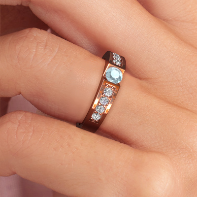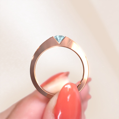The ring shown above is called the Lizzy 2. We call this type of ring a pavé solitaire ring because it has one centre gemstone and a band that is also pave set with gemstones. This engagement ring is made in 14 Carat rose gold set with a 4.2 mm round aquamarine, and pave set diamonds at the sides. Each piece of jewellery is made to shine bright around your finger. Each jewel is hand made with love by our goldsmiths.This modern rose gold pavé solitaire engagement ring has an exquisite round aquamarine centre stone. To further accentuate the centre stone, the band is set full with more diamonds. Its open prong setting allows light to strike the aquamarine from various angles and this adds sparkle to your aquamarine ring. The photo shown above depicts the goldsmith's carefully handcrafted details of the ring. The high positioning of the centre stone is truly eye-catching. The perfect engagement ring for the crown jewel of your life!By using a combination of the latest modern techniques, combined with ancient crafting, we can make all our engagement rings in our own studio. Each jewel is made to order. This is advantageous because we can offer you a price you won't find anywhere else.Our team adds new designs to our online collection daily. Our designers and goldsmiths work together in creating the best design. We strive to offer a diverse collection of jewels. Perhaps you have a specific jewel design in mind. One you came across somewhere. Please contact us for a free consultation. We will make you an offer, based on a fair price/ quality ratio, that will baffle you.To make it easier for you, we offer a 30 day return policy. Check our terms and conditions.