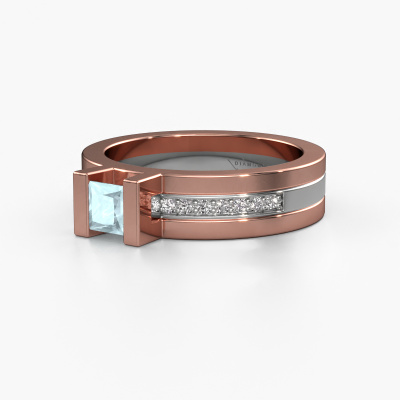 The ring shown above is called the Desire. We call this type of ring a pavé solitaire ring because it has one centre gemstone and a band that is also pave set with gemstones. The 14 Carat rose gold engagement ring is set with a princess 4 mm aquamarine centre stone and the band is pave set with diamond gemstones. Each jewel is made just for you by our master goldsmiths in our own studio.This modern rose gold pavé solitaire engagement ring has an exquisite princess aquamarine centre stone. To further accentuate the centre stone, the band is fully set with more diamonds. Its open prong setting allows light to strike the aquamarine from various angles and this adds sparkle to your aquamarine ring. The photo shown above depicts the goldsmith's carefully handcrafted details of the ring. The high positioning of the centre stone is truly eye-catching. The perfect engagement ring for the crown jewel of your life! By using a combination of the latest modern techniques, combined with ancient crafting, we can make all our engagement rings in our own studio. Each jewel is made to order. This is advantageous because we can offer you a price you won't find anywhere else.Have you found a specific engagement ring somewhere which you would like to give to your loved one? Please feel free to express your wishes to our jewel designers because we would be honoured to turn your design into a modern engagement ring. You can follow the development of your ring design because we use 3D drawings. This gives you a realistic preview of how your design will look. You can also preorder a dummy. A dummy is a plastic ring, which can be shaped according your ring design. You can try it on and check if its width and size are suitable for you. We will gladly send you a non-binding offer, based on a fair price/ quality ratio. It will amaze you, considering the quality of the ring and gemstones.To make it easier for you, we offer a 30 day return policy. Check our terms and conditions.
