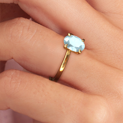 The ring shown above is called the Crystal OVL 1, we call this a solitaire ring because it contains a single gemstone. The engagement ring is made in 14 Carat gold and has a oval aquamarine of 8x6 mm. The cool thing about our configurator is that you can compile your own piece of jewellery, into a completely personalized one. This solitaire ring is crafted in the precious metals gold with gold, but of course you are free to pick your own colours. Each piece of jewellery is created to add sparkle to your finger, each jewel is lovingly made by hand by our goldsmiths.The solitaire ring is a special type of engagement ring. Its open prong setting allows light to strike the gemstone from various angles. This classic engagement ring is a stunning eye-catcher because of the high positioning of the gemstone. In order for you to commemorate your proposal with a unique ring, we carefully adorn this solitaire ring by hand. The love of your life deserves nothing but the best. Because we design and deliver our own rings, we can offer you a engagement ring at a price you won't find anywhere else. A ring is made to order, which helps prevent excess supplies, so we can make you a great price offer. We understand it feels risky, buying your engagement ring online, but we will gladly assist in the designing process, taking your budget into consideration.Our team adds new designs to our online collection daily. Our designers and goldsmiths work together in creating the best design. We strive to offer a diverse collection of jewels. Perhaps you have a specific jewel design in mind. One you came across somewhere. Please contact us for a free consultation. We will make you an offer, based on a fair price/ quality ratio, that will baffle you.To make it easier for you, we offer a 30 day return policy. Check our terms and conditions.