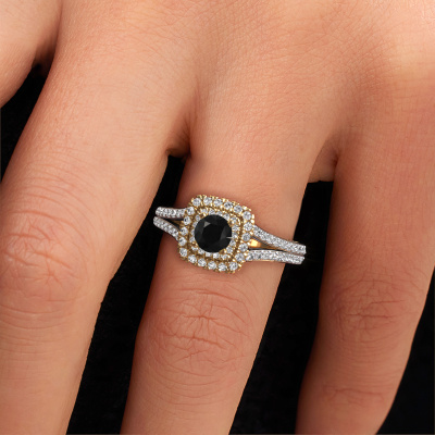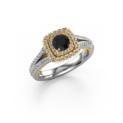 The ring shown above is called the Annette. We call this type of ring a halo ring because it has one centre gemstone and a band that is also pave set with gemstones. The 14 Carat white gold engagement ring is set with a round 0.60 crt black diamond centre stone and the band is pave set with diamond gemstones. Each jewel is made just for you by our master goldsmiths in our own studio.This vintage white gold halo engagement ring has an exquisite round black diamond centre stone. To further accentuate the centre stone, the band is fully set with more diamonds. Its open prong setting allows light to strike the black diamond from various angles and this adds sparkle to your black diamond ring. The photo shown above depicts the goldsmith's carefully handcrafted details of the ring. The high positioning of the centre stone is truly eye-catching. The perfect engagement ring for the crown jewel of your life! After receiving your order, our goldsmiths will passionately start the creative process of making your engagement ring in our own studio. Because we don't have a big stockpile, these costs will not be passed on to you. Our pricing is proof of that! We offer top quality jewels at lowest price, guaranteed.Have you found a specific engagement ring somewhere which you would like to give to your loved one? Please feel free to express your wishes to our jewel designers because we would be honoured to turn your design into a vintage engagement ring. You can follow the development of your ring design because we use 3D drawings. This gives you a realistic preview of how your design will look. You can also preorder a dummy. A dummy is a plastic ring, which can be shaped according your ring design. You can try it on and check if its width and size are suitable for you. We will gladly send you a non-binding offer, based on a fair price/ quality ratio. It will amaze you, considering the quality of the ring and gemstones.To make it easier for you, we offer a 30 day return policy. Check our terms and conditions.