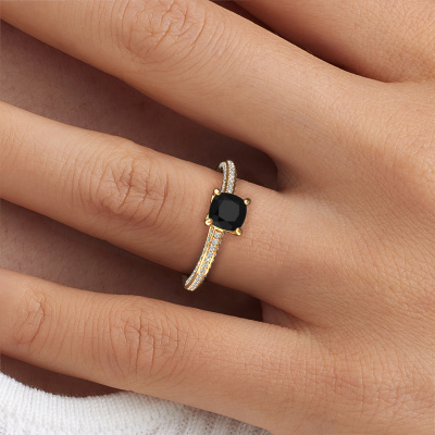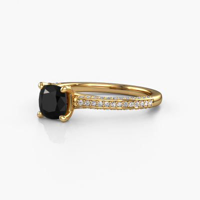The ring shown above is called the Elenore cus. We call this type of ring a pavé solitaire ring because it has one centre gemstone and a band that is also pave set with gemstones. This engagement ring is made in 14 Carat gold set with a 1.15 crt cushion black diamond, and pave set lab-grown diamonds at the sides. Each piece of jewellery is made by a team of passionate goldsmiths and jewel designers. This will make your crown jewel truly eye-catching.This contemporary gold pavé solitaire engagement ring has an exquisite cushion black diamond centre stone. To further accentuate the centre stone, the band is set full with more lab-grown diamonds. Its open prong setting allows light to strike the black diamond from various angles and this adds sparkle to your black diamond ring. The photo shown above depicts the goldsmith's carefully handcrafted details of the ring. The high positioning of the centre stone is truly eye-catching. The perfect engagement ring for the crown jewel of your life!After receiving your order, our goldsmiths will start the creative process of making your Elenore cus engagement ring. We don't keep stock. This is advantageous because these costs will not be passed on to you. Therefore, we can offer jewellery at exceptionally low prices.Have you found a specific engagement ring somewhere which you would like to give to your loved one? Please feel free to express your wishes to our jewel designers because we would be honoured to turn your design into a contemporary engagement ring. You can follow the development of your ring design because we use 3D drawings. This gives you a realistic preview of how your design will look. You can also preorder a dummy. A dummy is a plastic ring, which can be shaped according your ring design. You can try it on and check if its width and size are suitable for you. We will gladly send you a non-binding offer, based on a fair price/ quality ratio. It will amaze you, considering the quality of the ring and gemstones.To make it easier for you, we offer a 30 day return policy. Check our terms and conditions.