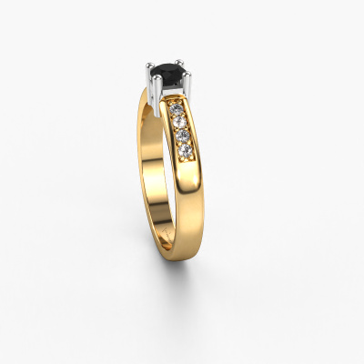 The ring shown above is called the Eline 2. We call this type of ring a pavé solitaire ring because it has one centre gemstone and a band that is also pave set with gemstones. The 14 Carat gold engagement ring is set with a round 0.24 crt black diamond centre stone and the band is pave set with diamond gemstones. Each jewel is unique in every way! Simply customize to your liking,This modern gold pavé solitaire engagement ring has an exquisite round black diamond centre stone. To further accentuate the centre stone, the band is fully set with more diamonds. Its open prong setting allows light to strike the black diamond from various angles and this adds sparkle to your black diamond ring. The photo shown above depicts the goldsmith's carefully handcrafted details of the ring. The high positioning of the centre stone is truly eye-catching. The perfect engagement ring for the crown jewel of your life! Because we design and deliver our own rings, we can offer you a engagement ring at a price you won't find anywhere else. A ring is made to order, which helps prevent excess supplies, so we can make you a great price offer. We understand it feels risky, buying your engagement ring online, but we will gladly assist in the designing process, taking your budget into consideration.Our team adds new designs to our online collection daily. Our designers and goldsmiths work together in creating the best design. We strive to offer a diverse collection of jewels. Perhaps you have a specific jewel design in mind. One you came across somewhere. Please contact us for a free consultation. We will make you an offer, based on a fair price/ quality ratio, that will baffle you.To make it easier for you, we offer a 30 day return policy. Check our terms and conditions.