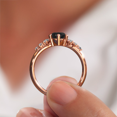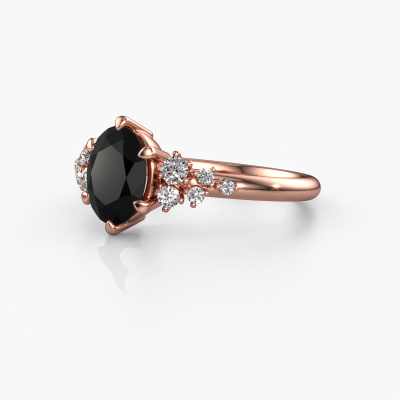 The ring shown above is called the Royce OVL. We call this type of ring a pavé solitaire ring because it has one centre gemstone and a band that is also pave set with gemstones. This engagement ring is made in 14 Carat rose gold set with a 1.40 crt oval black diamond, and pave set lab-grown diamonds at the sides. Each piece of jewellery is made with passion and love by one of our master goldsmiths.This fantasy rose gold pavé solitaire engagement ring has an exquisite oval black diamond centre stone. To further accentuate the centre stone, the band is set full with more lab-grown diamonds. Its open prong setting allows light to strike the black diamond from various angles and this adds sparkle to your black diamond ring. The photo shown above depicts the goldsmith's carefully handcrafted details of the ring. The high positioning of the centre stone is truly eye-catching. The perfect engagement ring for the crown jewel of your life!After receiving your order, our goldsmiths will passionately start the creative process of making your engagement ring in our own studio. Because we don't have a big stockpile, these costs will not be passed on to you. Our pricing is proof of that! We offer top quality jewels at lowest price, guaranteed.Have you found a specific engagement ring somewhere which you would like to give to your loved one? Please feel free to express your wishes to our jewel designers because we would be honoured to turn your design into a fantasy engagement ring. You can follow the development of your ring design because we use 3D drawings. This gives you a realistic preview of how your design will look. You can also preorder a dummy. A dummy is a plastic ring, which can be shaped according your ring design. You can try it on and check if its width and size are suitable for you. We will gladly send you a non-binding offer, based on a fair price/ quality ratio. It will amaze you, considering the quality of the ring and gemstones.To make it easier for you, we offer a 30 day return policy. Check our terms and conditions.