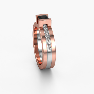 The ring shown above is called the Desire. We call this type of ring a pavé solitaire ring because it has one centre gemstone and a band that is also pave set with gemstones. The 14 Carat rose gold engagement ring is set with a princess 0.48 crt black diamond centre stone and the band is pave set with diamond gemstones. Each jewel is made just for you by our master goldsmiths in our own studio.This modern rose gold pavé solitaire engagement ring has an exquisite princess black diamond centre stone. To further accentuate the centre stone, the band is fully set with more diamonds. Its open prong setting allows light to strike the black diamond from various angles and this adds sparkle to your black diamond ring. The photo shown above depicts the goldsmith's carefully handcrafted details of the ring. The high positioning of the centre stone is truly eye-catching. The perfect engagement ring for the crown jewel of your life! By using a combination of the latest modern techniques, combined with ancient crafting, we can make all our engagement rings in our own studio. Each jewel is made to order. This is advantageous because we can offer you a price you won't find anywhere else.Have you found a specific engagement ring somewhere which you would like to give to your loved one? Please feel free to express your wishes to our jewel designers because we would be honoured to turn your design into a modern engagement ring. You can follow the development of your ring design because we use 3D drawings. This gives you a realistic preview of how your design will look. You can also preorder a dummy. A dummy is a plastic ring, which can be shaped according your ring design. You can try it on and check if its width and size are suitable for you. We will gladly send you a non-binding offer, based on a fair price/ quality ratio. It will amaze you, considering the quality of the ring and gemstones.To make it easier for you, we offer a 30 day return policy. Check our terms and conditions.