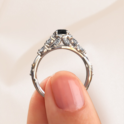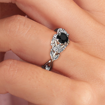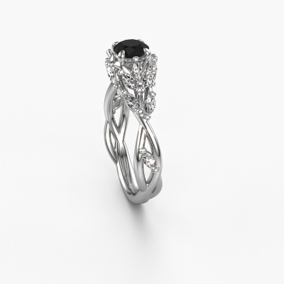 The ring shown above is called the Samantha RND. We call this type of ring a pavé solitaire ring because it has one centre gemstone and a band that is also pave set with gemstones. This engagement ring is made in 14 Carat white gold set with a 0.60 crt round black diamond, and pave set diamonds at the sides. Each piece of jewellery is made with passion and love by one of our master goldsmiths.This contemporary white gold pavé solitaire engagement ring has an exquisite round black diamond centre stone. To further accentuate the centre stone, the band is set full with more diamonds. Its open prong setting allows light to strike the black diamond from various angles and this adds sparkle to your black diamond ring. The photo shown above depicts the goldsmith's carefully handcrafted details of the ring. The high positioning of the centre stone is truly eye-catching. The perfect engagement ring for the crown jewel of your life!By using a combination of the latest modern techniques, combined with ancient crafting, we can make all our engagement rings in our own studio. Each jewel is made to order. This is advantageous because we can offer you a price you won't find anywhere else.Our designers and goldsmiths work together each day, creating new jewels. Perhaps you have found a nice contemporary engagement ring somewhere, which can be used to customize your unique ring. Please feel free to contact us. We will make you an offer, based on a fair price/ quality ratio, which will amaze you.To make it easier for you, we offer a 30 day return policy. Check our terms and conditions.