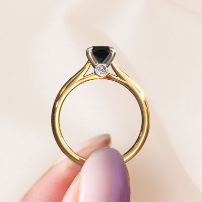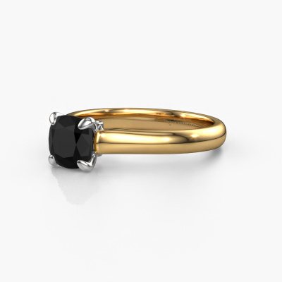 The ring shown above is called the Valorie cus 1, we call this a solitaire ring because it contains a single gemstone. The engagement ring is made in 14 Carat gold and has a cushion black diamond of 1.50 crt. The cool thing about our configurator is that you can compile your own piece of jewellery, into a completely personalized one. This solitaire ring is crafted in the precious metals gold with white gold, but of course you are free to pick your own colours. Each piece of jewellery is made to shine bright around your finger. Each jewel is hand made with love by our goldsmiths.The solitaire ring is a special type of engagement ring. Its open prong setting allows light to strike the gemstone from various angles. This classic engagement ring is a stunning eye-catcher because of the high positioning of the gemstone. In order for you to commemorate your proposal with a unique ring, we carefully adorn this solitaire ring by hand. The love of your life deserves nothing but the best. Are you on a budget? Please feel free to contact us, so we can go discuss your options. We offer our engagement rings at guaranteed best price, because we make them to order. You won't find such a price anywhere else!Have you found a specific engagement ring somewhere which you would like to give to your loved one? Please feel free to express your wishes to our jewel designers because we would be honoured to turn your design into a classic engagement ring. You can follow the development of your ring design because we use 3D drawings. This gives you a realistic preview of how your design will look. You can also preorder a dummy. A dummy is a plastic ring, which can be shaped according your ring design. You can try it on and check if its width and size are suitable for you. We will gladly send you a non-binding offer, based on a fair price/ quality ratio. It will amaze you, considering the quality of the ring and gemstones.To make it easier for you, we offer a 30 day return policy. Check our terms and conditions.
