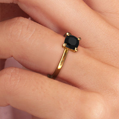 The ring shown above is called the Crystal CUS 1, we call this a solitaire ring because it contains a single gemstone. The engagement ring is made in 14 Carat gold and has a cushion black diamond of 1.15 crt. The cool thing about our configurator is that you can compile your own piece of jewellery, into a completely personalized one. This solitaire ring is crafted in the precious metals gold with gold, but of course you are free to pick your own colours. Each piece of jewellery is made with passion and love by one of our master goldsmiths.The solitaire ring is a special type of engagement ring. Its open prong setting allows light to strike the gemstone from various angles. This contemporary engagement ring is a stunning eye-catcher because of the high positioning of the gemstone. In order for you to commemorate your proposal with a unique ring, we carefully adorn this solitaire ring by hand. The love of your life deserves nothing but the best. Because we design and deliver our own rings, we can offer you a engagement ring at a price you won't find anywhere else. A ring is made to order, which helps prevent excess supplies, so we can make you a great price offer. We understand it feels risky, buying your engagement ring online, but we will gladly assist in the designing process, taking your budget into consideration.Our team adds new designs to our online collection daily. Our designers and goldsmiths work together in creating the best design. We strive to offer a diverse collection of jewels. Perhaps you have a specific jewel design in mind. One you came across somewhere. Please contact us for a free consultation. We will make you an offer, based on a fair price/ quality ratio, that will baffle you.To make it easier for you, we offer a 30 day return policy. Check our terms and conditions.
