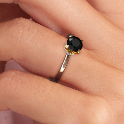 The ring shown above is called the Crystal RND 3, we call this a solitaire ring because it contains a single gemstone. The engagement ring is made in 14 Carat white gold and has a round black diamond of 0.78 crt. The cool thing about our configurator is that you can compile your own piece of jewellery, into a completely personalized one. This solitaire ring is crafted in the precious metals white gold with gold, but of course you are free to pick your own colours. Each piece of jewellery is made with passion and love by one of our master goldsmiths.The solitaire ring is a special type of engagement ring. Its open prong setting allows light to strike the gemstone from various angles. This classic engagement ring is a stunning eye-catcher because of the high positioning of the gemstone. In order for you to commemorate your proposal with a unique ring, we carefully adorn this solitaire ring by hand. The love of your life deserves nothing but the best. By using a combination of the latest modern techniques, combined with ancient crafting, we can make all our engagement rings in our own studio. Each jewel is made to order. This is advantageous because we can offer you a price you won't find anywhere else.Different styles of new rings are made daily by our team. Perhaps you have found a solitaire engagement ring somewhere. One you would like to give to your loved one. Please feel free to share your thoughts and design with our jewel designers. We would love to turn your design into a classic engagement ring. You can follow the development of your ring design because we use very detailed 3D drawings. On top of that, you can order a dummy of the design. A dummy is a plastic ring, which can be shaped according your ring design. You can try it on and check if the engagement ring is up to standard. We will gladly send you a non-binding offer, based on a fair price/ quality ratio. The offer will baffle you, considering the quality of the ring and gemstones.To make it easier for you, we offer a 30 day return policy. Check our terms and conditions.