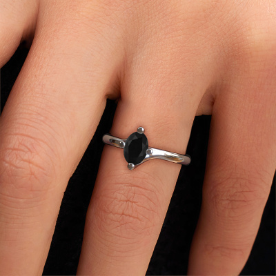 In your eyes, no one else compares to her. She is one in a million, unlike anyone else and pure? These qualities are emphasized perfectly by our modern white gold solitaire black diamond ring. This black diamond is carefully selected by our keen artisan goldsmiths. It equals the unique qualities of the love of your life. There is no better way to memorialize your proposal than this symbol of true love. The ring shown above is called the Dewi Oval, we call this a solitaire ring because it contains a single gemstone. The engagement ring is made in 14 Carat white gold and has a oval black diamond of 1.05 crt. Each piece of jewellery is made with passion and love by one of our master goldsmiths.Are you on a budget? Please feel free to contact us, so we can go discuss your options. We offer our engagement rings at guaranteed best price, because we make them to order. You won't find such a price anywhere else!Do you have a specific ring in mind? One you came across somewhere. Please feel free to tell us your wishes and we will turn your design into a unique engagement ring. You can follow the development of your ring design because we use 3D drawings. This gives you a realistic preview of your design. We will gladly send you a non-binding offer, based on a fair price/ quality ratio. It will amaze you.To make it easier for you, we offer a 30 day return policy. Check our terms and conditions.