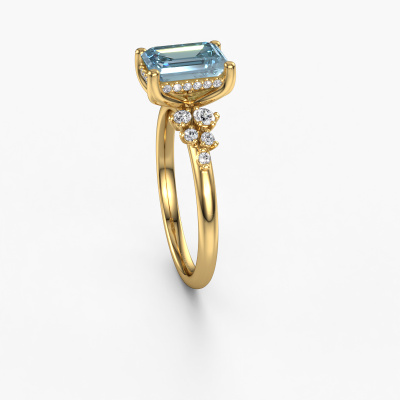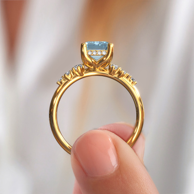The ring shown above is called the Emma EME. We call this type of ring a pavé solitaire ring because it has one centre gemstone and a band that is also pave set with gemstones. This engagement ring is made in 14 Carat gold set with a 8x6 mm emerald cut blue lab grown diamond, and pave set lab-grown diamonds at the sides. Each piece of jewellery is made with passion and love by one of our master goldsmiths.This fantasy gold pavé solitaire engagement ring has an exquisite emerald cut blue lab grown diamond centre stone. To further accentuate the centre stone, the band is set full with more lab-grown diamonds. Its open prong setting allows light to strike the blue lab grown diamond from various angles and this adds sparkle to your blue lab grown diamond ring. The photo shown above depicts the goldsmith's carefully handcrafted details of the ring. The high positioning of the centre stone is truly eye-catching. The perfect engagement ring for the crown jewel of your life!After receiving your order, our goldsmiths will passionately start the creative process of making your engagement ring in our own studio. Because we don't have a big stockpile, these costs will not be passed on to you. Our pricing is proof of that! We offer top quality jewels at lowest price, guaranteed.Our team adds new designs to our online collection daily. Our designers and goldsmiths work together in creating the best design. We strive to offer a diverse collection of jewels. Perhaps you have a specific jewel design in mind. One you came across somewhere. Please contact us for a free consultation. We will make you an offer, based on a fair price/ quality ratio, that will baffle you.To make it easier for you, we offer a 30 day return policy. Check our terms and conditions.