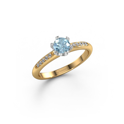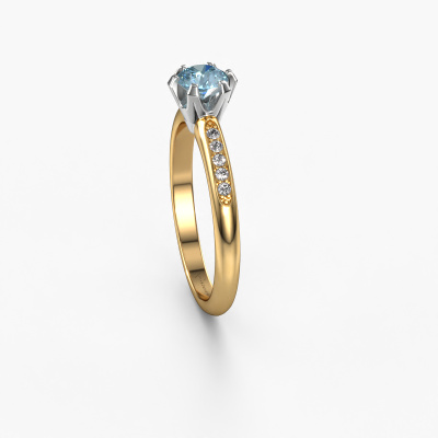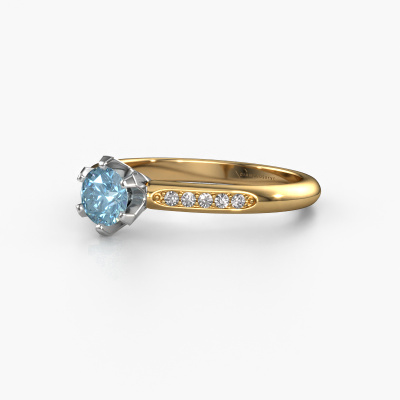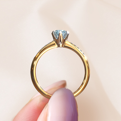 The ring shown above is called the Tiffy 2. We call this type of ring a pavé solitaire ring because it has one centre gemstone and a band that is also pave set with gemstones. This engagement ring is made in 14 Carat gold set with a 4.7 mm round blue lab grown diamond, and pave set diamonds at the sides. Each piece of jewellery is created to add sparkle to your finger, each jewel is lovingly made by hand by our goldsmiths.This traditional gold pavé solitaire engagement ring has an exquisite round blue lab grown diamond centre stone. To further accentuate the centre stone, the band is set full with more diamonds. Its open prong setting allows light to strike the blue lab grown diamond from various angles and this adds sparkle to your blue lab grown diamond ring. The photo shown above depicts the goldsmith's carefully handcrafted details of the ring. The high positioning of the centre stone is truly eye-catching. The perfect engagement ring for the crown jewel of your life!