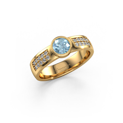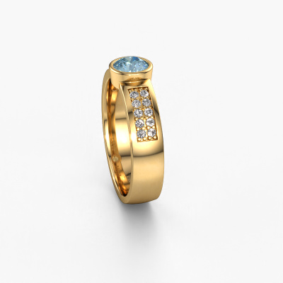 The ring shown above is called the Ise 3. We call this type of ring a pavé solitaire ring because it has one centre gemstone and a band that is also pave set with gemstones. The 14 Carat gold engagement ring is set with a round 4.7 mm blue lab grown diamond centre stone and the band is pave set with diamond gemstones. Each jewel is made just for you by our master goldsmiths in our own studio.This modern gold pavé solitaire engagement ring has an exquisite round blue lab grown diamond centre stone. To further accentuate the centre stone, the band is fully set with more diamonds. Its open prong setting allows light to strike the blue lab grown diamond from various angles and this adds sparkle to your blue lab grown diamond ring. The photo shown above depicts the goldsmith's carefully handcrafted details of the ring. The high positioning of the centre stone is truly eye-catching. The perfect engagement ring for the crown jewel of your life!