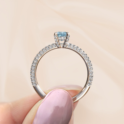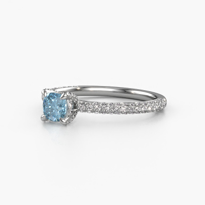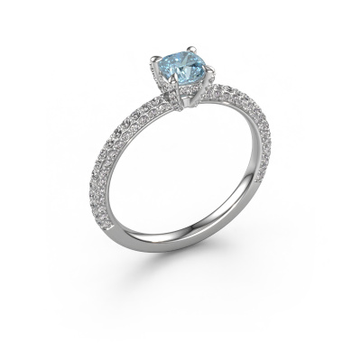 The ring shown above is called the Saskia 2 cus. We call this type of ring a pavé solitaire ring because it has one centre gemstone and a band that is also pave set with gemstones. The platinum engagement ring is set with a cushion 4.5 mm blue lab grown diamond centre stone and the band is pave set with lab grown diamond gemstones. Each jewel is made just for you, with attention to detail and design.This contemporary platinum pavé solitaire engagement ring has an exquisite cushion blue lab grown diamond centre stone. To further accentuate the centre stone, the band is fully set with more lab-grown diamonds. Its open prong setting allows light to strike the blue lab grown diamond from various angles and this adds sparkle to your blue lab grown diamond ring. The photo shown above depicts the goldsmith's carefully handcrafted details of the ring. The high positioning of the centre stone is truly eye-catching. The perfect engagement ring for the crown jewel of your life! Are you on a budget? Please feel free to contact us, so we can go discuss your options. We offer our engagement rings at guaranteed best price, because we make them to order. You won't find such a price anywhere else!Our designers and goldsmiths work together each day, creating new jewels. Perhaps you have found a nice contemporary engagement ring somewhere, which can be used to customize your unique ring. Please feel free to contact us. We will make you an offer, based on a fair price/ quality ratio, which will amaze you.To make it easier for you, we offer a 30 day return policy. Check our terms and conditions.