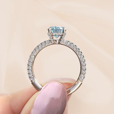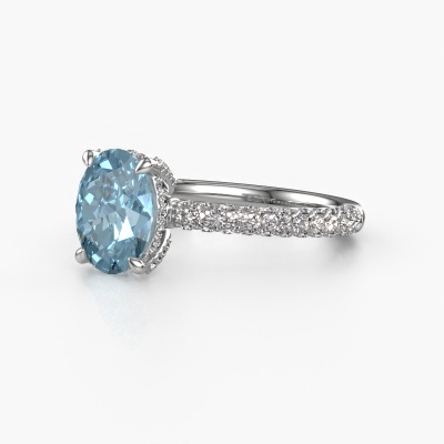 The ring shown above is called the Saskia 2 ovl. We call this type of ring a pavé solitaire ring because it has one centre gemstone and a band that is also pave set with gemstones. The platinum engagement ring is set with a oval 9x7 mm blue lab grown diamond centre stone and the band is pave set with lab grown diamond gemstones. Each jewel is made just for you by our master goldsmiths in our own studio.This exclusive platinum pavé solitaire engagement ring has an exquisite oval blue lab grown diamond centre stone. To further accentuate the centre stone, the band is fully set with more lab-grown diamonds. Its open prong setting allows light to strike the blue lab grown diamond from various angles and this adds sparkle to your blue lab grown diamond ring. The photo shown above depicts the goldsmith's carefully handcrafted details of the ring. The high positioning of the centre stone is truly eye-catching. The perfect engagement ring for the crown jewel of your life! After receiving your order, our goldsmiths will passionately start the creative process of making your engagement ring in our own studio. Because we don't have a big stockpile, these costs will not be passed on to you. Our pricing is proof of that! We offer top quality jewels at lowest price, guaranteed.Have you found a specific engagement ring somewhere which you would like to give to your loved one? Please feel free to express your wishes to our jewel designers because we would be honoured to turn your design into a exclusive engagement ring. You can follow the development of your ring design because we use 3D drawings. This gives you a realistic preview of how your design will look. You can also preorder a dummy. A dummy is a plastic ring, which can be shaped according your ring design. You can try it on and check if its width and size are suitable for you. We will gladly send you a non-binding offer, based on a fair price/ quality ratio. It will amaze you, considering the quality of the ring and gemstones.To make it easier for you, we offer a 30 day return policy. Check our terms and conditions.