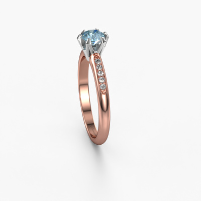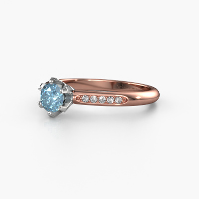 The ring shown above is called the Tiffy 2. We call this type of ring a pavé solitaire ring because it has one centre gemstone and a band that is also pave set with gemstones. This engagement ring is made in 14 Carat rose gold set with a 4.7 mm round blue lab grown diamond, and pave set diamonds at the sides. Each piece of jewellery is created to add sparkle to your finger, each jewel is lovingly made by hand by our goldsmiths.This traditional rose gold pavé solitaire engagement ring has an exquisite round blue lab grown diamond centre stone. To further accentuate the centre stone, the band is set full with more diamonds. Its open prong setting allows light to strike the blue lab grown diamond from various angles and this adds sparkle to your blue lab grown diamond ring. The photo shown above depicts the goldsmith's carefully handcrafted details of the ring. The high positioning of the centre stone is truly eye-catching. The perfect engagement ring for the crown jewel of your life!