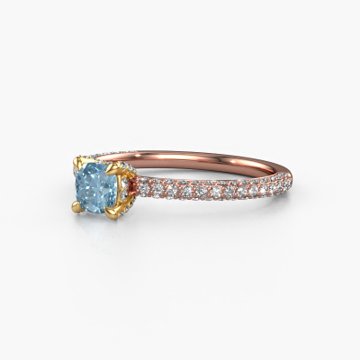 The ring shown above is called the Saskia 2 cus. We call this type of ring a pavé solitaire ring because it has one centre gemstone and a band that is also pave set with gemstones. The 14 Carat rose gold engagement ring is set with a cushion 4.5 mm blue lab grown diamond centre stone and the band is pave set with lab grown diamond gemstones. Each jewel is made just for you, with attention to detail and design.This contemporary rose gold pavé solitaire engagement ring has an exquisite cushion blue lab grown diamond centre stone. To further accentuate the centre stone, the band is fully set with more lab-grown diamonds. Its open prong setting allows light to strike the blue lab grown diamond from various angles and this adds sparkle to your blue lab grown diamond ring. The photo shown above depicts the goldsmith's carefully handcrafted details of the ring. The high positioning of the centre stone is truly eye-catching. The perfect engagement ring for the crown jewel of your life! Are you on a budget? Please feel free to contact us, so we can go discuss your options. We offer our engagement rings at guaranteed best price, because we make them to order. You won't find such a price anywhere else!Our designers and goldsmiths work together each day, creating new jewels. Perhaps you have found a nice contemporary engagement ring somewhere, which can be used to customize your unique ring. Please feel free to contact us. We will make you an offer, based on a fair price/ quality ratio, which will amaze you.To make it easier for you, we offer a 30 day return policy. Check our terms and conditions.
