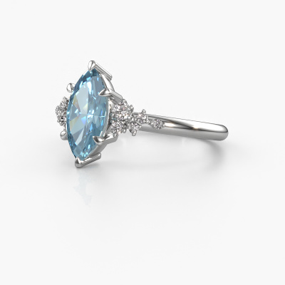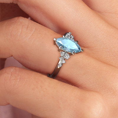 The ring shown above is called the Royce MRQ. We call this type of ring a pavé solitaire ring because it has one centre gemstone and a band that is also pave set with gemstones. This engagement ring is made in 14 Carat white gold set with a 11x5.5