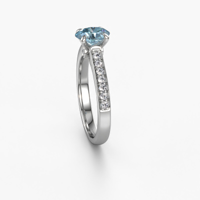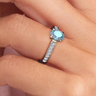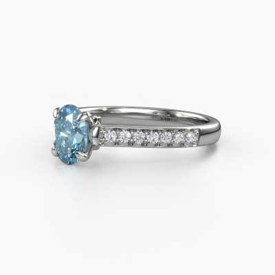 The ring shown above is called the Valorie ovl 2. We call this type of ring a pavé solitaire ring because it has one centre gemstone and a band that is also pave set with gemstones. This engagement ring is made in 14 Carat white gold set with a 7x5 mm oval blue lab grown diamond, and pave set lab-grown diamonds at the sides. Each piece of jewellery is made with passion and love by one of our master goldsmiths.This fashionable white gold pavé solitaire engagement ring has an exquisite oval blue lab grown diamond centre stone. To further accentuate the centre stone, the band is set full with more lab-grown diamonds. Its open prong setting allows light to strike the blue lab grown diamond from various angles and this adds sparkle to your blue lab grown diamond ring. The photo shown above depicts the goldsmith's carefully handcrafted details of the ring. The high positioning of the centre stone is truly eye-catching. The perfect engagement ring for the crown jewel of your life!Are you on a budget? Please feel free to contact us, so we can go discuss your options. We offer our engagement rings at guaranteed best price, because we make them to order. You won't find such a price anywhere else!Our team adds new designs to our online collection daily. Our designers and goldsmiths work together in creating the best design. We strive to offer a diverse collection of jewels. Perhaps you have a specific jewel design in mind. One you came across somewhere. Please contact us for a free consultation. We will make you an offer, based on a fair price/ quality ratio, that will baffle you.To make it easier for you, we offer a 30 day return policy. Check our terms and conditions.