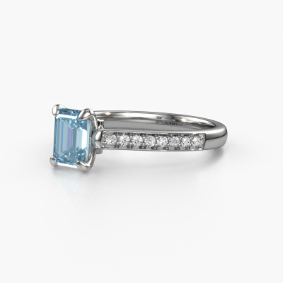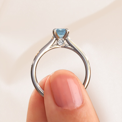 The ring shown above is called the Valorie eme 2. We call this type of ring a pavé solitaire ring because it has one centre gemstone and a band that is also pave set with gemstones. The 14 Carat white gold engagement ring is set with a emerald cut 6.5x4.5 mm blue lab grown diamond centre stone and the band is pave set with diamond gemstones. Each jewel is made by a team of passionate goldsmiths and jewel designers. This will make your crown jewel truly eye-catching.This classic white gold pavé solitaire engagement ring has an exquisite emerald cut blue lab grown diamond centre stone. To further accentuate the centre stone, the band is fully set with more diamonds. Its open prong setting allows light to strike the blue lab grown diamond from various angles and this adds sparkle to your blue lab grown diamond ring. The photo shown above depicts the goldsmith's carefully handcrafted details of the ring. The high positioning of the centre stone is truly eye-catching. The perfect engagement ring for the crown jewel of your life! By using our modern techniques, we can design and customize the finest quality jewels with the utmost care for you. Our engagement rings are always priced 30 percent lower than other jewellers. We make engagement rings to order so we don't have to maintain a large stock. If you have a certain budget, we are more than happy to advice you accordingly.Have you found a specific engagement ring somewhere which you would like to give to your loved one? Please feel free to express your wishes to our jewel designers because we would be honoured to turn your design into a classic engagement ring. You can follow the development of your ring design because we use 3D drawings. This gives you a realistic preview of how your design will look. You can also preorder a dummy. A dummy is a plastic ring, which can be shaped according your ring design. You can try it on and check if its width and size are suitable for you. We will gladly send you a non-binding offer, based on a fair price/ quality ratio. It will amaze you, considering the quality of the ring and gemstones.To make it easier for you, we offer a 30 day return policy. Check our terms and conditions.