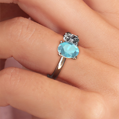 This platinum ring is called Toi et Moi OVL-OVL and is set with blue topaz. How would you describe the style of the love of your life? Does she have a unique sense of style? This stunning sublime platinum engagement ring can be custom-made to your own or her liking. Our blue topaz gemstones have been carefully selected because we believe your modern engagement ring must be adorned with nothing but the most beautiful gemstone. Don't you agree? This jewel is made by a team of passionate goldsmiths and jewel designers. This will make your crown jewel truly eye-catching.After receiving your order, our goldsmiths will start the creative process of making your Toi et Moi OVL-OVL engagement ring. We don't keep stock. This is advantageous because these costs will not be passed on to you. Therefore, we can offer jewellery at exceptionally low prices.Different styles of new rings are made daily by our team. Perhaps you have found a 2 stone engagement ring somewhere. One you would like to give to your loved one. Please feel free to share your thoughts and design with our jewel designers. We would love to turn your design into a modern engagement ring. You can follow the development of your ring design because we use very detailed 3D drawings. On top of that, you can order a dummy of the design. A dummy is a plastic ring, which can be shaped according your ring design. You can try it on and check if the engagement ring is up to standard. We will gladly send you a non-binding offer, based on a fair price/ quality ratio. The offer will baffle you, considering the quality of the ring and gemstones.To make it easier for you, we offer a 30 day return policy. Check our terms and conditions.
