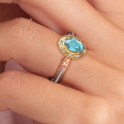 This 14 Carat rose gold ring is called Alice OVL and is set with 7x5 mm blue topaz. What is it that makes your relationship unique? What is it about her that makes you want to bend down on one knee? The unique bond between the two of you is emphasized by an equally unique ring. A one of a kind filigree halo engagement ring made especially for her. That is why this vintage ring fits her like a glove. Each specific detail of this filigree rose gold blue topaz set engagement ring is hand-picked, crafted and polished by our expert goldsmith. The result is an exquisite ring, unique and perfectly crafted to perfection. That is what our expert Goldsmiths strive for. This jewel is made with passion and love by one of our master goldsmiths.By using our modern techniques, we can design and customize the finest quality jewels with the utmost care for you. Our engagement rings are always priced 30 percent lower than other jewellers. We make engagement rings to order so we don't have to maintain a large stock. If you have a certain budget, we are more than happy to advice you accordingly.Our team adds new designs to our online collection daily. Our designers and goldsmiths work together in creating the best design. We strive to offer a diverse collection of jewels. Perhaps you have a specific jewel design in mind. One you came across somewhere. Please contact us for a free consultation. We will make you an offer, based on a fair price/ quality ratio, that will baffle you.To make it easier for you, we offer a 30 day return policy. Check our terms and conditions.