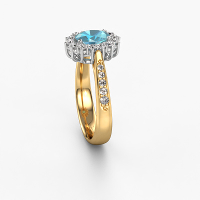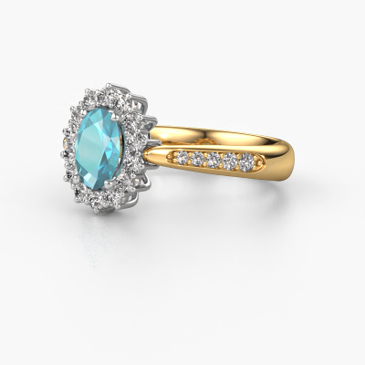 The ring shown above is called the Margien 2. We call this a Lady Diana ring. With an Lady Diana engagement ring, the larger centre gem is encircled by smaller side stones. This 14 Carat gold ring is set with a 7x5 mm oval blue topaz gemstone, surrounded by smaller diamonds side stones. It's the most famous and celebrated engagement ring in the world; The Lady Diana ring. Exclusively meant for the most remarkable person in your life! A truly stunning aspect of this Lady Diana ring is its centre blue topaz. The smaller side stones embracing the blue topaz emphasize the sparkle of the centre gemstone, this makes it look as though they merge into one big gemstone. Due to its design, this is even more apparent in the Lady Di ring. Our expert Goldsmiths are keen to create a unique ring just for you. We can even customize the ring to your liking in our own crafting studio. This piece of jewellery is created to add sparkle to your finger, each jewel is lovingly made by hand by our goldsmiths.Are you on a budget? Please feel free to contact us, so we can go discuss your options. We offer our engagement rings at guaranteed best price, because we make them to order. You won't find such a price anywhere else!Our team adds new designs to our online collection daily. Our designers and goldsmiths work together in creating the best design. We strive to offer a diverse collection of jewels. Perhaps you have a specific jewel design in mind. One you came across somewhere. Please contact us for a free consultation. We will make you an offer, based on a fair price/ quality ratio, that will baffle you.To make it easier for you, we offer a 30 day return policy. Check our terms and conditions.