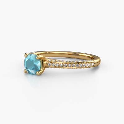 The ring shown above is called the Elenore rnd. We call this type of ring a pavé solitaire ring because it has one centre gemstone and a band that is also pave set with gemstones. This engagement ring is made in 14 Carat gold set with a 5.4 mm round blue topaz, and pave set lab-grown diamonds at the sides. Each piece of jewellery is made just for you by our master goldsmiths in our own studio.This exclusive gold pavé solitaire engagement ring has an exquisite round blue topaz centre stone. To further accentuate the centre stone, the band is set full with more lab-grown diamonds. Its open prong setting allows light to strike the blue topaz from various angles and this adds sparkle to your blue topaz ring. The photo shown above depicts the goldsmith's carefully handcrafted details of the ring. The high positioning of the centre stone is truly eye-catching. The perfect engagement ring for the crown jewel of your life!By using a combination of the latest modern techniques, combined with ancient crafting, we can make all our engagement rings in our own studio. Each jewel is made to order. This is advantageous because we can offer you a price you won't find anywhere else.Have you found a specific engagement ring somewhere which you would like to give to your loved one? Please feel free to express your wishes to our jewel designers because we would be honoured to turn your design into a exclusive engagement ring. You can follow the development of your ring design because we use 3D drawings. This gives you a realistic preview of how your design will look. You can also preorder a dummy. A dummy is a plastic ring, which can be shaped according your ring design. You can try it on and check if its width and size are suitable for you. We will gladly send you a non-binding offer, based on a fair price/ quality ratio. It will amaze you, considering the quality of the ring and gemstones.To make it easier for you, we offer a 30 day return policy. Check our terms and conditions.
