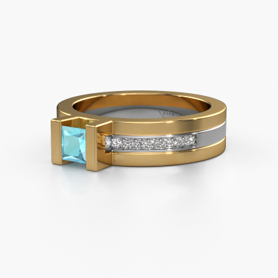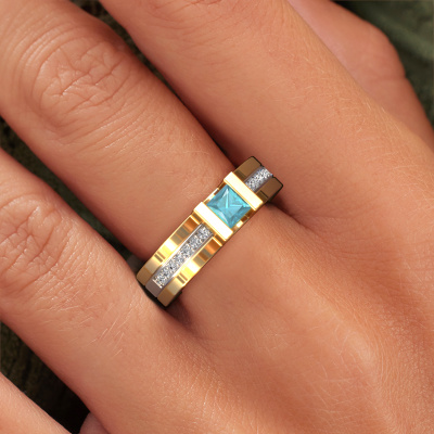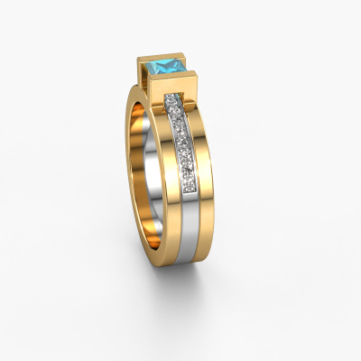 The ring shown above is called the Desire. We call this type of ring a pavé solitaire ring because it has one centre gemstone and a band that is also pave set with gemstones. The 14 Carat gold engagement ring is set with a princess 4 mm blue topaz centre stone and the band is pave set with diamond gemstones. Each jewel is made just for you by our master goldsmiths in our own studio.This modern gold pavé solitaire engagement ring has an exquisite princess blue topaz centre stone. To further accentuate the centre stone, the band is fully set with more diamonds. Its open prong setting allows light to strike the blue topaz from various angles and this adds sparkle to your blue topaz ring. The photo shown above depicts the goldsmith's carefully handcrafted details of the ring. The high positioning of the centre stone is truly eye-catching. The perfect engagement ring for the crown jewel of your life! By using a combination of the latest modern techniques, combined with ancient crafting, we can make all our engagement rings in our own studio. Each jewel is made to order. This is advantageous because we can offer you a price you won't find anywhere else.Have you found a specific engagement ring somewhere which you would like to give to your loved one? Please feel free to express your wishes to our jewel designers because we would be honoured to turn your design into a modern engagement ring. You can follow the development of your ring design because we use 3D drawings. This gives you a realistic preview of how your design will look. You can also preorder a dummy. A dummy is a plastic ring, which can be shaped according your ring design. You can try it on and check if its width and size are suitable for you. We will gladly send you a non-binding offer, based on a fair price/ quality ratio. It will amaze you, considering the quality of the ring and gemstones.To make it easier for you, we offer a 30 day return policy. Check our terms and conditions.