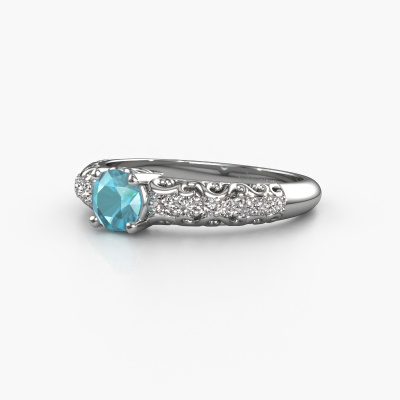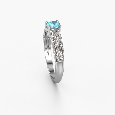 This platinum ring is called Mellie and is set with 5 mm blue topaz. What is it that makes your relationship unique? What is it about her that makes you want to bend down on one knee? The unique bond between the two of you is emphasized by an equally unique ring. A one of a kind filigree pavé solitaire engagement ring made especially for her. That is why this vintage ring fits her like a glove. Each specific detail of this filigree platinum blue topaz set engagement ring is hand-picked, crafted and polished by our expert goldsmith. The result is an exquisite ring, unique and perfectly crafted to perfection. That is what our expert Goldsmiths strive for. This jewel is made by a team of passionate goldsmiths and jewel designers. This will make your crown jewel truly eye-catching.Are you on a budget? Please feel free to contact us, so we can go discuss your options. We offer our engagement rings at guaranteed best price, because we make them to order. You won't find such a price anywhere else!Have you found a specific engagement ring somewhere which you would like to give to your loved one? Please feel free to express your wishes to our jewel designers because we would be honoured to turn your design into a vintage engagement ring. You can follow the development of your ring design because we use 3D drawings. This gives you a realistic preview of how your design will look. You can also preorder a dummy. A dummy is a plastic ring, which can be shaped according your ring design. You can try it on and check if its width and size are suitable for you. We will gladly send you a non-binding offer, based on a fair price/ quality ratio. It will amaze you, considering the quality of the ring and gemstones.To make it easier for you, we offer a 30 day return policy. Check our terms and conditions.