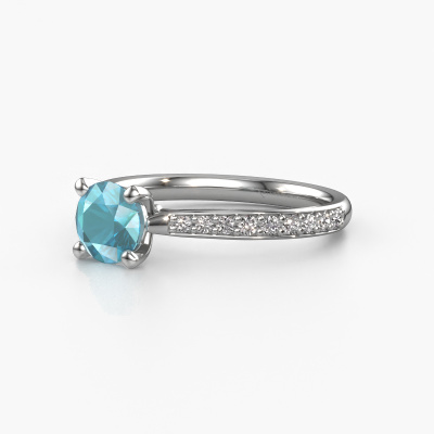 The ring shown above is called the Mignon rnd 2. We call this type of ring a pavé solitaire ring because it has one centre gemstone and a band that is also pave set with gemstones. The platinum engagement ring is set with a round 6 mm blue topaz centre stone and the band is pave set with lab grown diamond gemstones. Each jewel is made by a team of passionate goldsmiths and jewel designers. This will make your crown jewel truly eye-catching.This luxury platinum pavé solitaire engagement ring has an exquisite round blue topaz centre stone. To further accentuate the centre stone, the band is fully set with more lab-grown diamonds. Its open prong setting allows light to strike the blue topaz from various angles and this adds sparkle to your blue topaz ring. The photo shown above depicts the goldsmith's carefully handcrafted details of the ring. The high positioning of the centre stone is truly eye-catching. The perfect engagement ring for the crown jewel of your life! By using our modern techniques, we can design and customize the finest quality jewels with the utmost care for you. Our engagement rings are always priced 30 percent lower than other jewellers. We make engagement rings to order so we don't have to maintain a large stock. If you have a certain budget, we are more than happy to advice you accordingly.Different styles of new rings are made daily by our team. Perhaps you have found a pavé solitaire engagement ring somewhere. One you would like to give to your loved one. Please feel free to share your thoughts and design with our jewel designers. We would love to turn your design into a luxury engagement ring. You can follow the development of your ring design because we use very detailed 3D drawings. On top of that, you can order a dummy of the design. A dummy is a plastic ring, which can be shaped according your ring design. You can try it on and check if the engagement ring is up to standard. We will gladly send you a non-binding offer, based on a fair price/ quality ratio. The offer will baffle you, considering the quality of the ring and gemstones.To make it easier for you, we offer a 30 day return policy. Check our terms and conditions.
