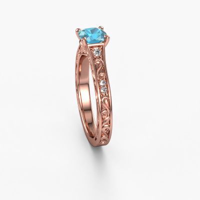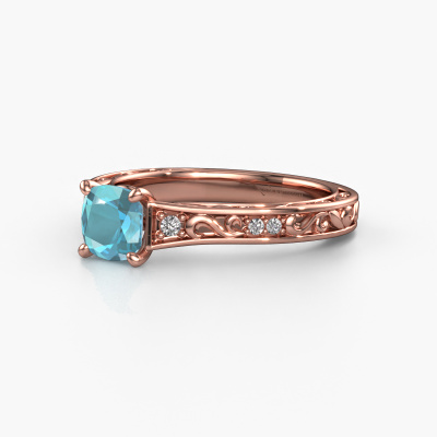 The ring shown above is called the Mallory cus. We call this type of ring a pavé solitaire ring because it has one centre gemstone and a band that is also pave set with gemstones. This engagement ring is made in 14 Carat rose gold set with a 5.5 mm cushion blue topaz, and pave set diamonds at the sides. Each piece of jewellery is made just for you by our master goldsmiths in our own studio.This Celtic rose gold pavé solitaire engagement ring has an exquisite cushion blue topaz centre stone. To further accentuate the centre stone, the band is set full with more diamonds. Its open prong setting allows light to strike the blue topaz from various angles and this adds sparkle to your blue topaz ring. The photo shown above depicts the goldsmith's carefully handcrafted details of the ring. The high positioning of the centre stone is truly eye-catching. The perfect engagement ring for the crown jewel of your life!By using our modern techniques, we can design and customize the finest quality jewels with the utmost care for you. Our engagement rings are always priced 30 percent lower than other jewellers. We make engagement rings to order so we don't have to maintain a large stock. If you have a certain budget, we are more than happy to advice you accordingly.Different styles of new rings are made daily by our team. Perhaps you have found a pavé solitaire engagement ring somewhere. One you would like to give to your loved one. Please feel free to share your thoughts and design with our jewel designers. We would love to turn your design into a Celtic engagement ring. You can follow the development of your ring design because we use very detailed 3D drawings. On top of that, you can order a dummy of the design. A dummy is a plastic ring, which can be shaped according your ring design. You can try it on and check if the engagement ring is up to standard. We will gladly send you a non-binding offer, based on a fair price/ quality ratio. The offer will baffle you, considering the quality of the ring and gemstones.To make it easier for you, we offer a 30 day return policy. Check our terms and conditions.