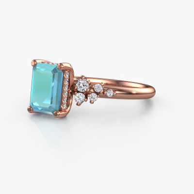 The ring shown above is called the Emma EME. We call this type of ring a pavé solitaire ring because it has one centre gemstone and a band that is also pave set with gemstones. This engagement ring is made in 14 Carat rose gold set with a 8x6 mm emerald cut blue topaz, and pave set lab-grown diamonds at the sides. Each piece of jewellery is made with passion and love by one of our master goldsmiths.This fantasy rose gold pavé solitaire engagement ring has an exquisite emerald cut blue topaz centre stone. To further accentuate the centre stone, the band is set full with more lab-grown diamonds. Its open prong setting allows light to strike the blue topaz from various angles and this adds sparkle to your blue topaz ring. The photo shown above depicts the goldsmith's carefully handcrafted details of the ring. The high positioning of the centre stone is truly eye-catching. The perfect engagement ring for the crown jewel of your life!After receiving your order, our goldsmiths will passionately start the creative process of making your engagement ring in our own studio. Because we don't have a big stockpile, these costs will not be passed on to you. Our pricing is proof of that! We offer top quality jewels at lowest price, guaranteed.Our team adds new designs to our online collection daily. Our designers and goldsmiths work together in creating the best design. We strive to offer a diverse collection of jewels. Perhaps you have a specific jewel design in mind. One you came across somewhere. Please contact us for a free consultation. We will make you an offer, based on a fair price/ quality ratio, that will baffle you.To make it easier for you, we offer a 30 day return policy. Check our terms and conditions.