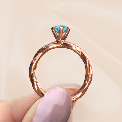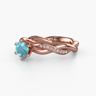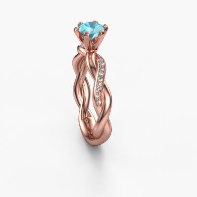 In your eyes, no one else compares to her. She is one in a million, unlike anyone else and pure? These qualities are emphasized perfectly by our fantasy rose gold solitaire blue topaz ring. This blue topaz is carefully selected by our keen artisan goldsmiths. It equals the unique qualities of the love of your life. There is no better way to memorialize your proposal than this symbol of true love. The ring shown above is called the Page, we call this a solitaire ring because it contains a single gemstone. The engagement ring is made in 14 Carat rose gold and has a round blue topaz of 5.4 mm. Each piece of jewellery is made with passion and love by one of our master goldsmiths.Are you on a budget? Please feel free to contact us, so we can go discuss your options. We offer our engagement rings at guaranteed best price, because we make them to order. You won't find such a price anywhere else!Do you have a specific ring in mind? One you came across somewhere. Please feel free to tell us your wishes and we will turn your design into a unique engagement ring. You can follow the development of your ring design because we use 3D drawings. This gives you a realistic preview of your design. We will gladly send you a non-binding offer, based on a fair price/ quality ratio. It will amaze you.To make it easier for you, we offer a 30 day return policy. Check our terms and conditions.