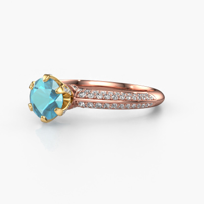 The ring shown above is called the Abby. We call this type of ring a pavé solitaire ring because it has one centre gemstone and a band that is also pave set with gemstones. The 14 Carat rose gold engagement ring is set with a round 6.5 mm blue topaz centre stone and the band is pave set with diamond gemstones. Each jewel is made just for you by our master goldsmiths in our own studio.This exclusive rose gold pavé solitaire engagement ring has an exquisite round blue topaz centre stone. To further accentuate the centre stone, the band is fully set with more diamonds. Its open prong setting allows light to strike the blue topaz from various angles and this adds sparkle to your blue topaz ring. The photo shown above depicts the goldsmith's carefully handcrafted details of the ring. The high positioning of the centre stone is truly eye-catching. The perfect engagement ring for the crown jewel of your life! Are you on a budget? Please feel free to contact us, so we can go discuss your options. We offer our engagement rings at guaranteed best price, because we make them to order. You won't find such a price anywhere else!Our team adds new designs to our online collection daily. Our designers and goldsmiths work together in creating the best design. We strive to offer a diverse collection of jewels. Perhaps you have a specific jewel design in mind. One you came across somewhere. Please contact us for a free consultation. We will make you an offer, based on a fair price/ quality ratio, that will baffle you.To make it easier for you, we offer a 30 day return policy. Check our terms and conditions.