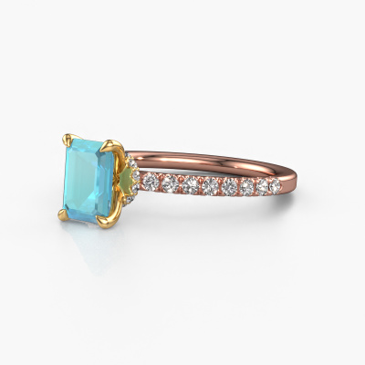 The ring shown above is called the Crystal EME 4. We call this type of ring a pavé solitaire ring because it has one centre gemstone and a band that is also pave set with gemstones. The 14 Carat rose gold engagement ring is set with a emerald cut 7x5 mm blue topaz centre stone and the band is pave set with lab grown diamond gemstones. Each jewel is created to add sparkle to your finger, each jewel is lovingly made by hand by our goldsmiths.This fashionable rose gold pavé solitaire engagement ring has an exquisite emerald cut blue topaz centre stone. To further accentuate the centre stone, the band is fully set with more lab-grown diamonds. Its open prong setting allows light to strike the blue topaz from various angles and this adds sparkle to your blue topaz ring. The photo shown above depicts the goldsmith's carefully handcrafted details of the ring. The high positioning of the centre stone is truly eye-catching. The perfect engagement ring for the crown jewel of your life! After receiving your order, our goldsmiths will passionately start the creative process of making your engagement ring in our own studio. Because we don't have a big stockpile, these costs will not be passed on to you. Our pricing is proof of that! We offer top quality jewels at lowest price, guaranteed.Our team adds new designs to our online collection daily. Our designers and goldsmiths work together in creating the best design. We strive to offer a diverse collection of jewels. Perhaps you have a specific jewel design in mind. One you came across somewhere. Please contact us for a free consultation. We will make you an offer, based on a fair price/ quality ratio, that will baffle you.To make it easier for you, we offer a 30 day return policy. Check our terms and conditions.