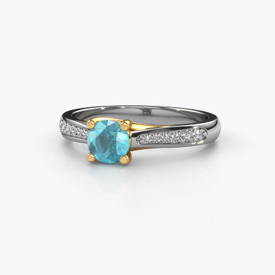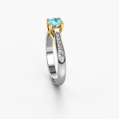 The ring shown above is called the Mia 2. We call this type of ring a pavé solitaire ring because it has one centre gemstone and a band that is also pave set with gemstones. This engagement ring is made in 14 Carat white gold set with a 5 mm round blue topaz, and pave set lab-grown diamonds at the sides. Each piece of jewellery is made just for you, with attention to detail and design.This modern white gold pavé solitaire engagement ring has an exquisite round blue topaz centre stone. To further accentuate the centre stone, the band is set full with more lab-grown diamonds. Its open prong setting allows light to strike the blue topaz from various angles and this adds sparkle to your blue topaz ring. The photo shown above depicts the goldsmith's carefully handcrafted details of the ring. The high positioning of the centre stone is truly eye-catching. The perfect engagement ring for the crown jewel of your life!By using our modern techniques, we can design and customize the finest quality jewels with the utmost care for you. Our engagement rings are always priced 30 percent lower than other jewellers. We make engagement rings to order so we don't have to maintain a large stock. If you have a certain budget, we are more than happy to advice you accordingly.Different styles of new rings are made daily by our team. Perhaps you have found a pavé solitaire engagement ring somewhere. One you would like to give to your loved one. Please feel free to share your thoughts and design with our jewel designers. We would love to turn your design into a modern engagement ring. You can follow the development of your ring design because we use very detailed 3D drawings. On top of that, you can order a dummy of the design. A dummy is a plastic ring, which can be shaped according your ring design. You can try it on and check if the engagement ring is up to standard. We will gladly send you a non-binding offer, based on a fair price/ quality ratio. The offer will baffle you, considering the quality of the ring and gemstones.To make it easier for you, we offer a 30 day return policy. Check our terms and conditions.