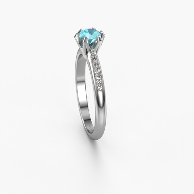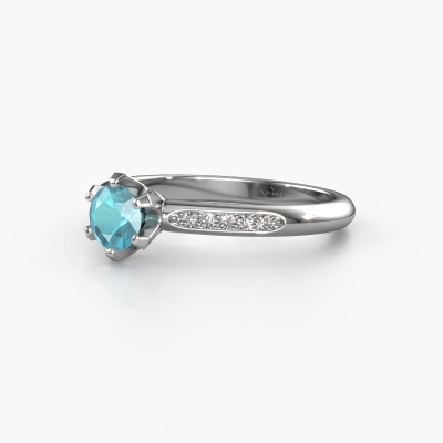 The ring shown above is called the Tiffy 2. We call this type of ring a pavé solitaire ring because it has one centre gemstone and a band that is also pave set with gemstones. This engagement ring is made in 14 Carat white gold set with a 4.7 mm round blue topaz, and pave set diamonds at the sides. Each piece of jewellery is created to add sparkle to your finger, each jewel is lovingly made by hand by our goldsmiths.This traditional white gold pavé solitaire engagement ring has an exquisite round blue topaz centre stone. To further accentuate the centre stone, the band is set full with more diamonds. Its open prong setting allows light to strike the blue topaz from various angles and this adds sparkle to your blue topaz ring. The photo shown above depicts the goldsmith's carefully handcrafted details of the ring. The high positioning of the centre stone is truly eye-catching. The perfect engagement ring for the crown jewel of your life!By using our modern techniques, we can design and customize the finest quality jewels with the utmost care for you. Our engagement rings are always priced 30 percent lower than other jewellers. We make engagement rings to order so we don't have to maintain a large stock. If you have a certain budget, we are more than happy to advice you accordingly.Our designers and goldsmiths work together each day, creating new jewels. Perhaps you have found a nice traditional engagement ring somewhere, which can be used to customize your unique ring. Please feel free to contact us. We will make you an offer, based on a fair price/ quality ratio, which will amaze you.To make it easier for you, we offer a 30 day return policy. Check our terms and conditions.