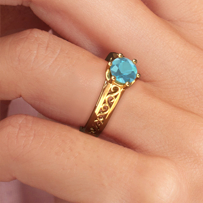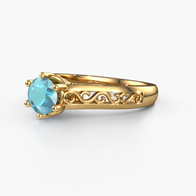 The ring shown above is called the Shan, we call this a solitaire ring because it contains a single gemstone. The engagement ring is made in 14 Carat gold and has a round blue topaz of 6 mm. The cool thing about our configurator is that you can compile your own piece of jewellery, into a completely personalized one. This solitaire ring is crafted in the precious metals gold with gold, but of course you are free to pick your own colours. Each piece of jewellery is made by a team of passionate goldsmiths and jewel designers. This will make your crown jewel truly eye-catching.The solitaire ring is a special type of engagement ring. Its open prong setting allows light to strike the gemstone from various angles. This Celtic engagement ring is a stunning eye-catcher because of the high positioning of the gemstone. In order for you to commemorate your proposal with a unique ring, we carefully adorn this solitaire ring by hand. The love of your life deserves nothing but the best. By using our modern techniques, we can design and customize the finest quality jewels with the utmost care for you. Our engagement rings are always priced 30 percent lower than other jewellers. We make engagement rings to order so we don't have to maintain a large stock. If you have a certain budget, we are more than happy to advice you accordingly.Have you found a specific engagement ring somewhere which you would like to give to your loved one? Please feel free to express your wishes to our jewel designers because we would be honoured to turn your design into a Celtic engagement ring. You can follow the development of your ring design because we use 3D drawings. This gives you a realistic preview of how your design will look. You can also preorder a dummy. A dummy is a plastic ring, which can be shaped according your ring design. You can try it on and check if its width and size are suitable for you. We will gladly send you a non-binding offer, based on a fair price/ quality ratio. It will amaze you, considering the quality of the ring and gemstones.To make it easier for you, we offer a 30 day return policy. Check our terms and conditions.