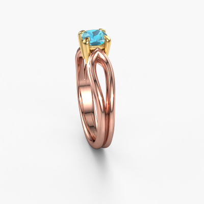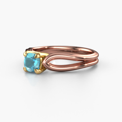 The ring shown above is called the Antonia cus 1, we call this a solitaire ring because it contains a single gemstone. The engagement ring is made in 14 Carat rose gold and has a cushion blue topaz of 5 mm. The cool thing about our configurator is that you can compile your own piece of jewellery, into a completely personalized one. This solitaire ring is crafted in the precious metals rose gold with gold, but of course you are free to pick your own colours. Each piece of jewellery is made by a team of passionate goldsmiths and jewel designers. This will make your crown jewel truly eye-catching.The solitaire ring is a special type of engagement ring. Its open prong setting allows light to strike the gemstone from various angles. This fantasy engagement ring is a stunning eye-catcher because of the high positioning of the gemstone. In order for you to commemorate your proposal with a unique ring, we carefully adorn this solitaire ring by hand. The love of your life deserves nothing but the best. Are you on a budget? Please feel free to contact us, so we can go discuss your options. We offer our engagement rings at guaranteed best price, because we make them to order. You won't find such a price anywhere else!Our team adds new designs to our online collection daily. Our designers and goldsmiths work together in creating the best design. We strive to offer a diverse collection of jewels. Perhaps you have a specific jewel design in mind. One you came across somewhere. Please contact us for a free consultation. We will make you an offer, based on a fair price/ quality ratio, that will baffle you.To make it easier for you, we offer a 30 day return policy. Check our terms and conditions.