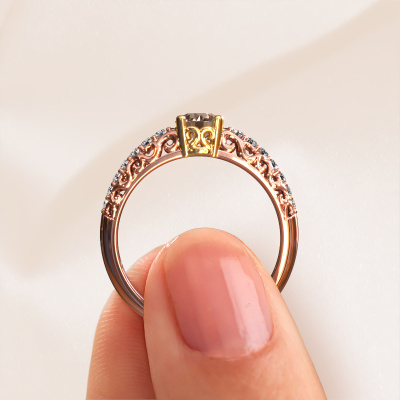 This 14 Carat rose gold ring is called Mellie and is set with 0.72 crt brown diamond. What is it that makes your relationship unique? What is it about her that makes you want to bend down on one knee? The unique bond between the two of you is emphasized by an equally unique ring. A one of a kind filigree pavé solitaire engagement ring made especially for her. That is why this vintage ring fits her like a glove. Each specific detail of this filigree rose gold brown diamond set engagement ring is hand-picked, crafted and polished by our expert goldsmith. The result is an exquisite ring, unique and perfectly crafted to perfection. That is what our expert Goldsmiths strive for. This jewel is made by a team of passionate goldsmiths and jewel designers. This will make your crown jewel truly eye-catching.Are you on a budget? Please feel free to contact us, so we can go discuss your options. We offer our engagement rings at guaranteed best price, because we make them to order. You won't find such a price anywhere else!Have you found a specific engagement ring somewhere which you would like to give to your loved one? Please feel free to express your wishes to our jewel designers because we would be honoured to turn your design into a vintage engagement ring. You can follow the development of your ring design because we use 3D drawings. This gives you a realistic preview of how your design will look. You can also preorder a dummy. A dummy is a plastic ring, which can be shaped according your ring design. You can try it on and check if its width and size are suitable for you. We will gladly send you a non-binding offer, based on a fair price/ quality ratio. It will amaze you, considering the quality of the ring and gemstones.To make it easier for you, we offer a 30 day return policy. Check our terms and conditions.